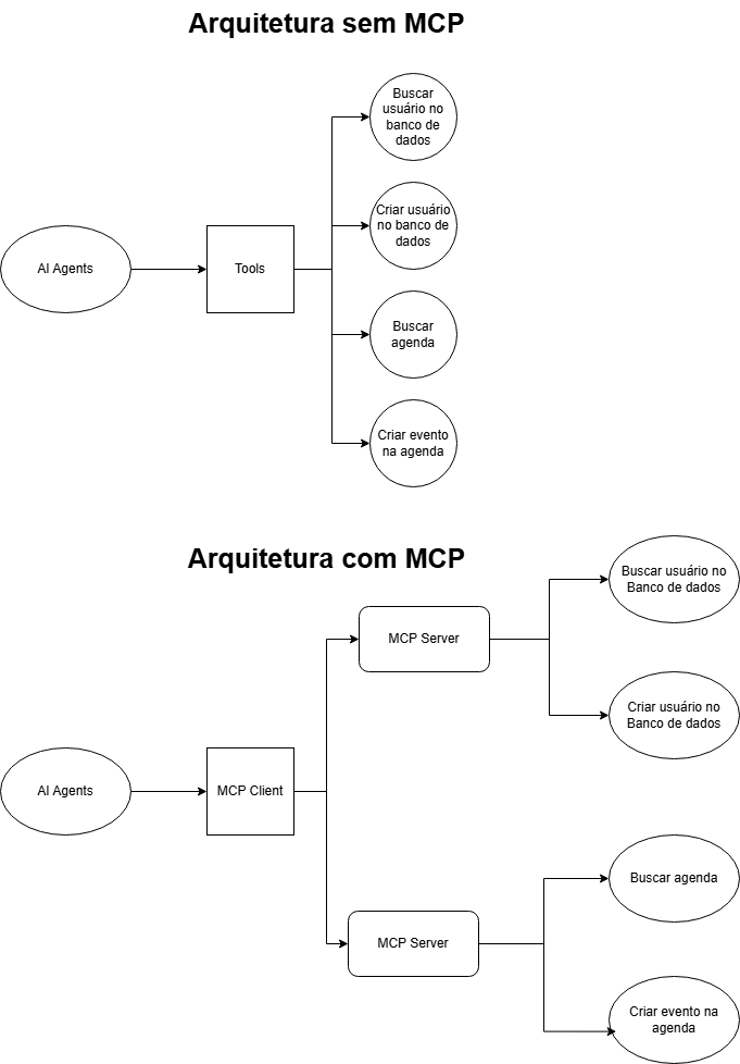 O MCP, portanto, é um pilar fundamental para a próxima geração de agentes inteligentes, e entender sua lógica é essencial para quem deseja aplicar IA de forma estratégica nos negócios. Abaixo demonstramos como é uma arquitetura de automação usando o conceito do MCP e sem o uso do mesmo.